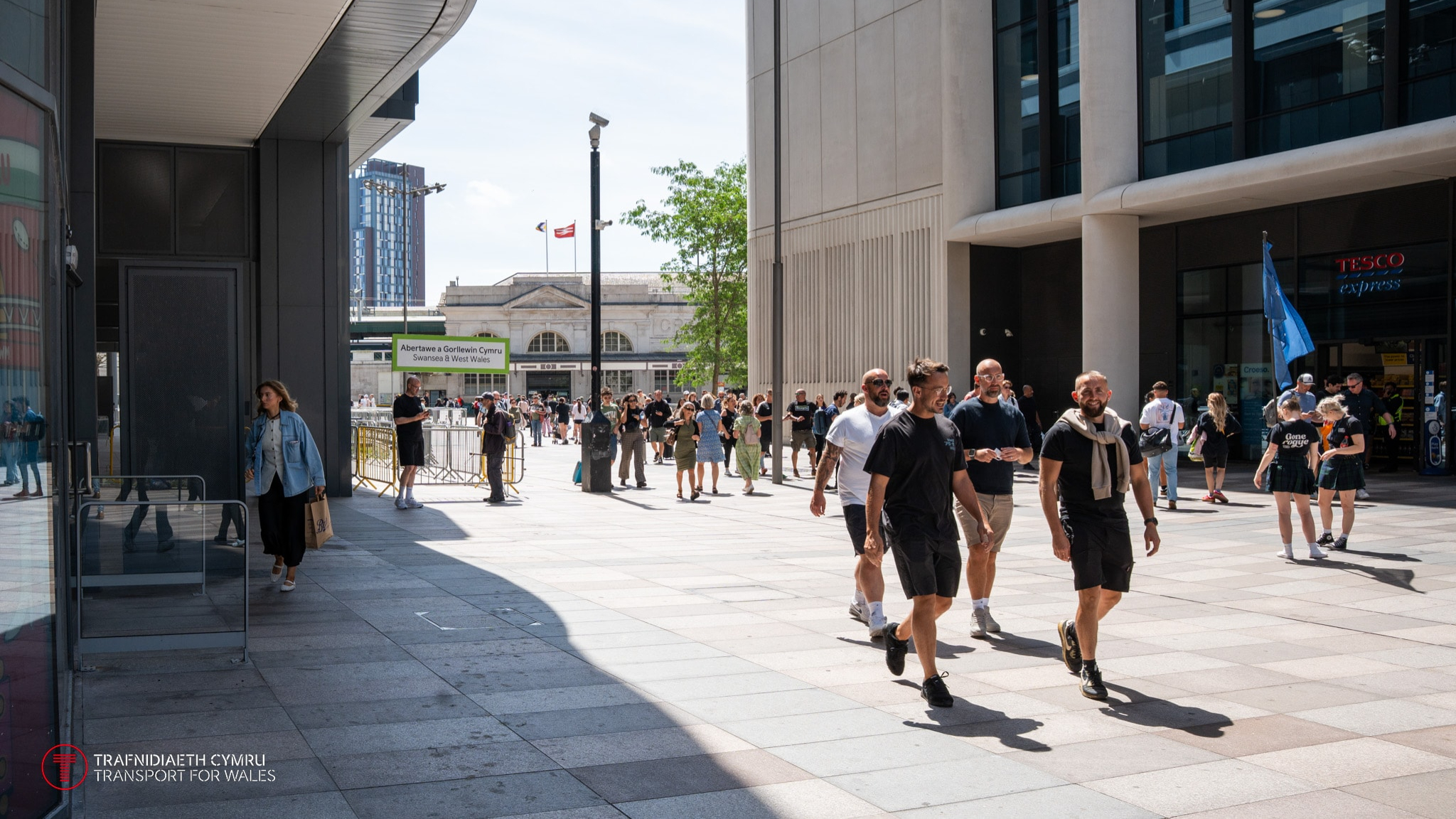 Y tu mewn i orsafoedd ac o amgylch Caerdydd Canolog, rydym wedi cynllunio ardaloedd rheoli torfeydd yn ofalus. Nid mater o giwio yn unig yw'r rhain, maent yn ymwneud â chadw pobl yn ddiogel, atal tagfeydd a sicrhau bod mynediad brys yn parhau i fod yn glir.
