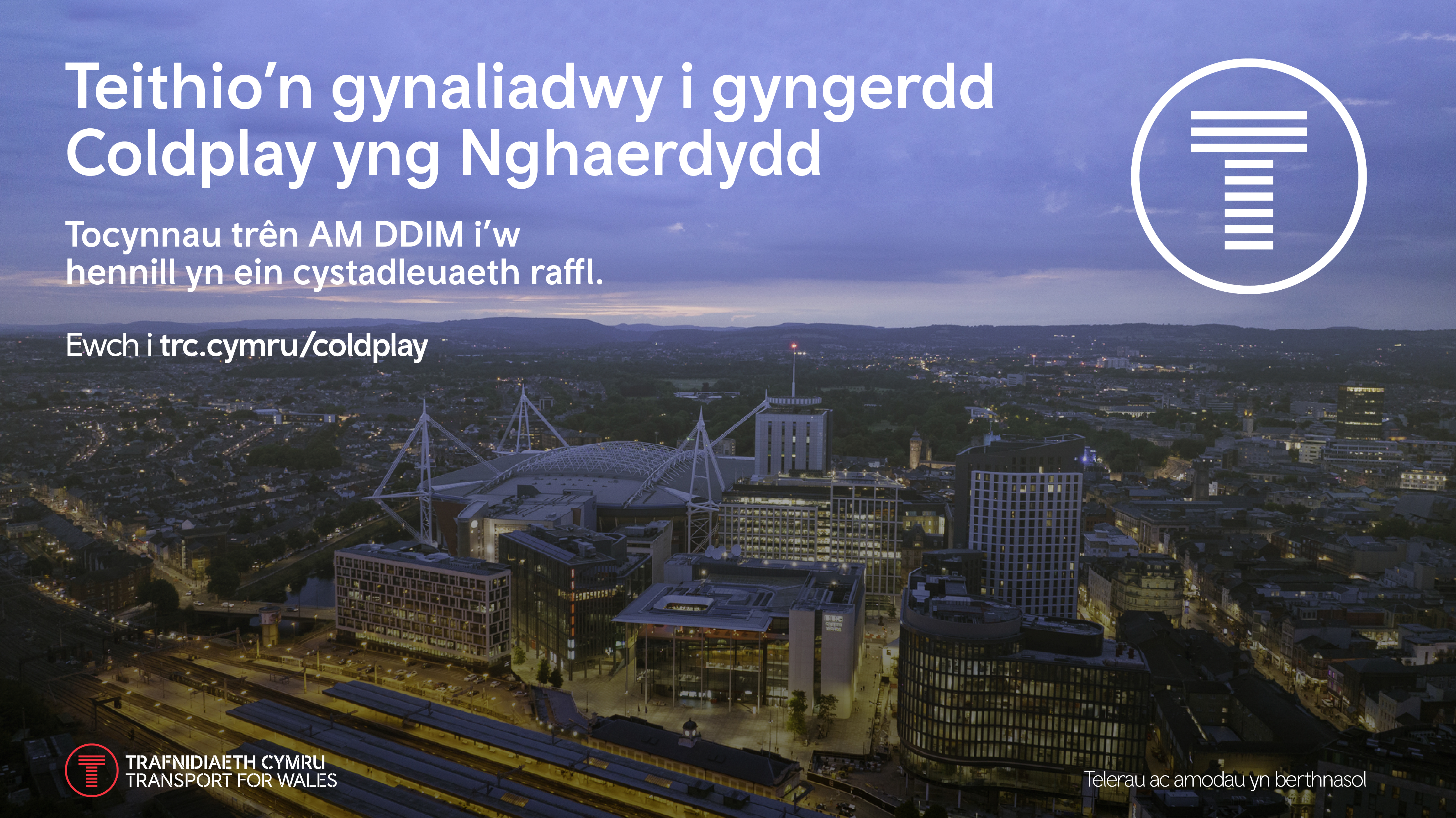 Bydd Coldplay yn perfformio yn Stadiwm Principality ar Fehefin 6 a 7 yr wythnos nesaf fel rhan o'u Taith Byd ‘Music of the Spheres’ ac maent wedi partneru â TrC i annog teithiau trên cynaliadwy i Gaerdydd.