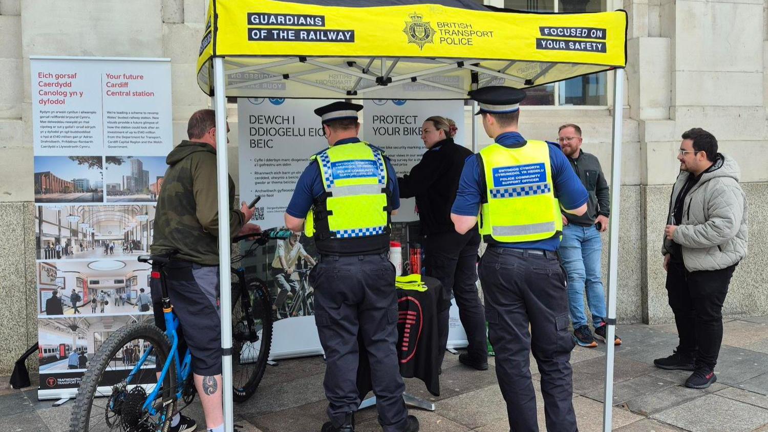 Dywedodd yr Arolygydd Alun Derrick o Heddlu Trafnidiaeth Prydeinig: "Mae'n wych gweithio gyda TrC eto yr haf hwn, wrth i ni roi cyfle i deithwyr dderbyn marc diogelwch ar eu beiciau. Yn ogystal â hyn, gallant gwrdd â'n swyddogion a derbyn cyngor pellach ar atal troseddu. "Hoffwn hefyd atgoffa pobl i arbed y rhif 61016 yn eich ffôn, fel bod gennych chi'r rhif wrth law pe bai byth angen ein cymorth arnoch.”