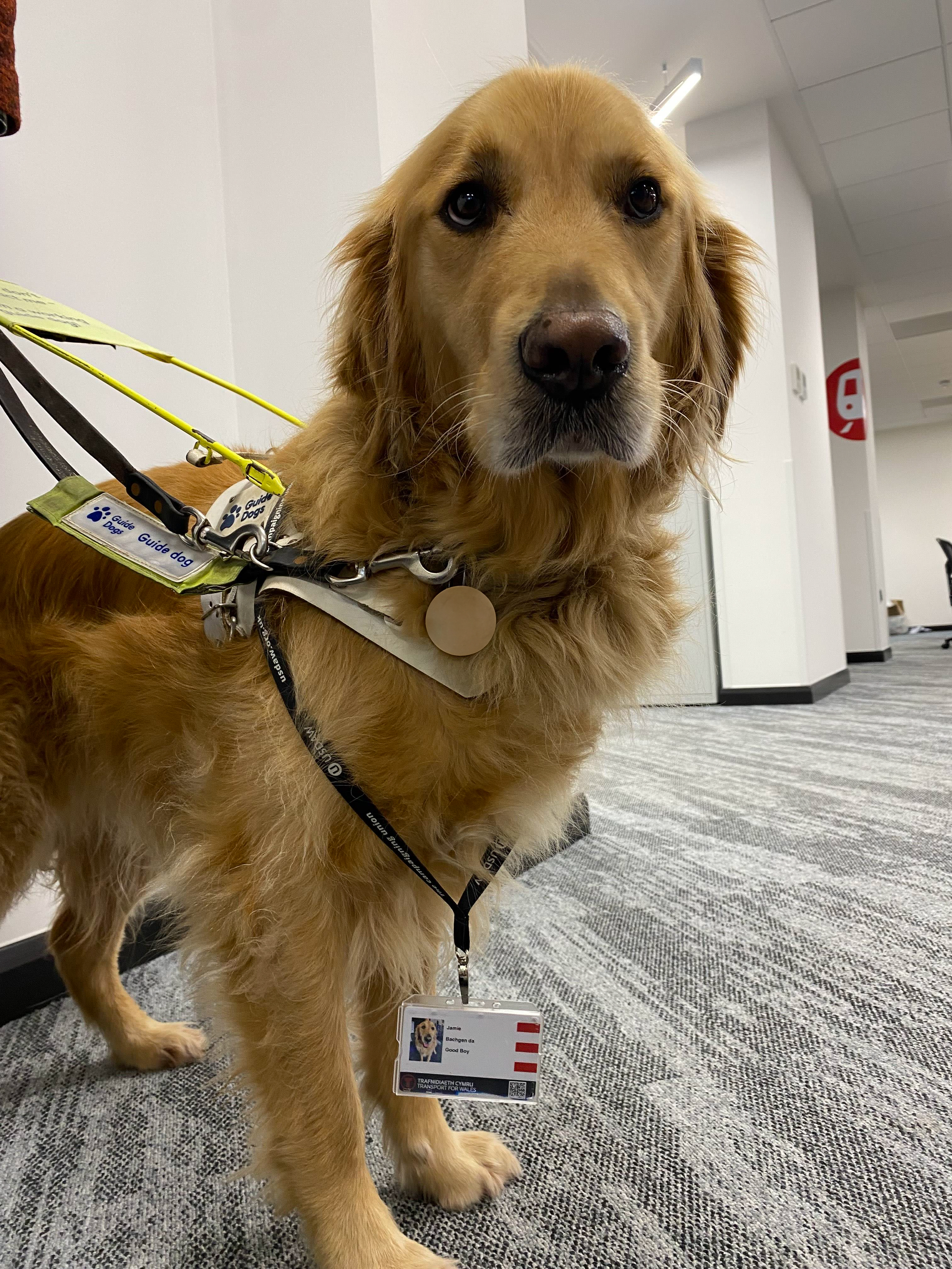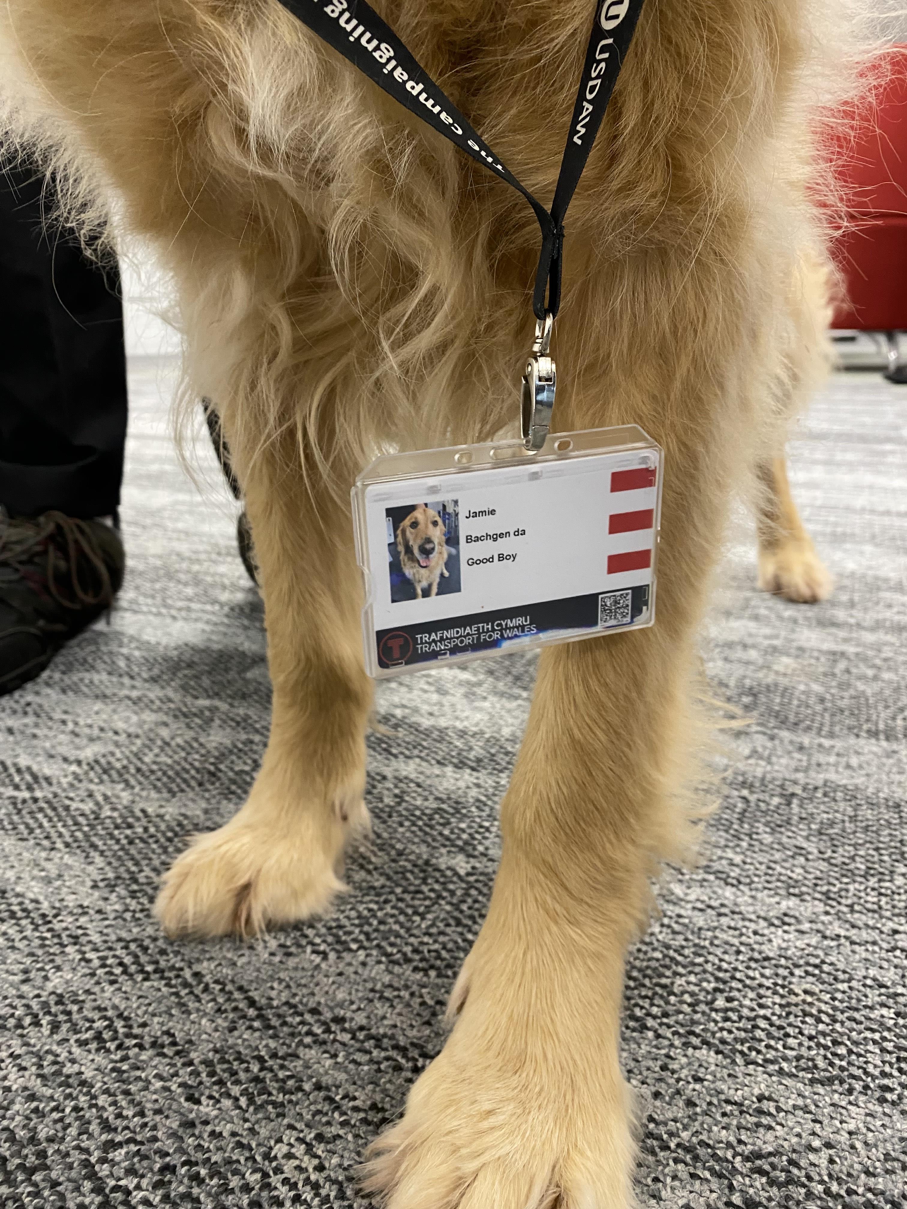Mae golden retriever o’r enw Jamie wedi dod yn aelod newydd (ac ella mwyaf poblogaidd) o dîm Trafnidiaeth Cymru (TrC).