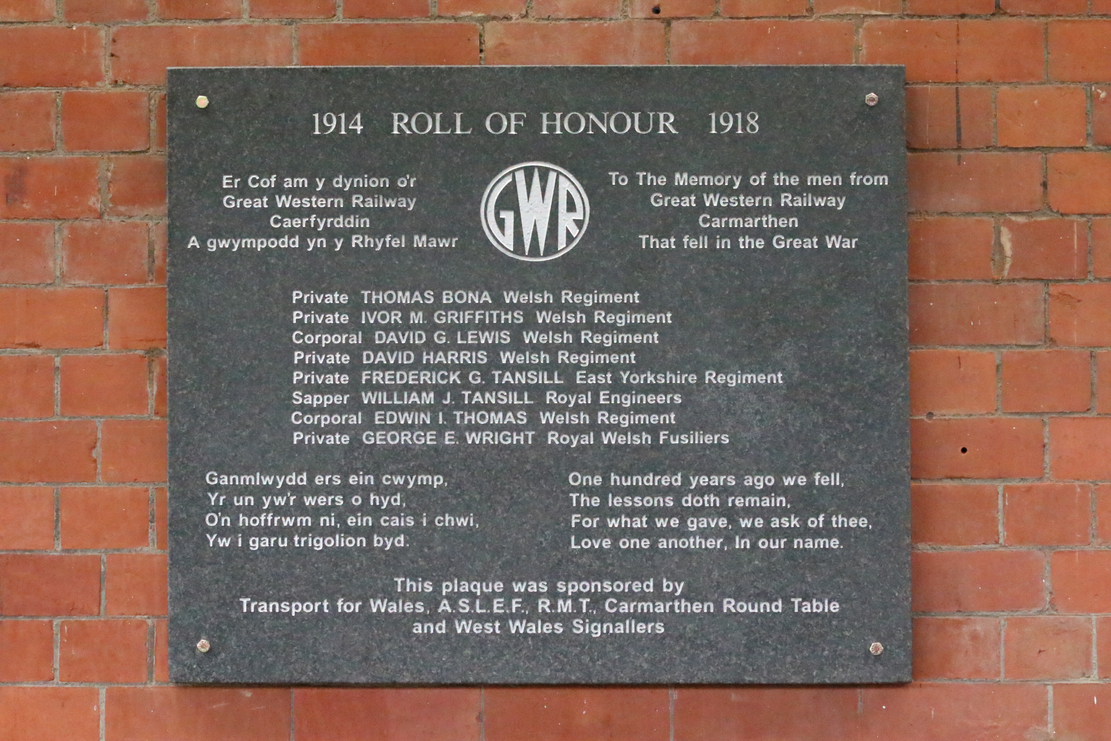 Mae’r plac yn cofio wyth o ddynion o hen ddepo GWR a fu’n brwydro ac a fu farw dros eu gwlad. Maent yn cynnwys y brodyr Tansill a gafodd eu magu yn rhif 1 Tonwy Villa, Station Road, Caerfyrddin, sydd dal yn sefyll hyd heddiw.