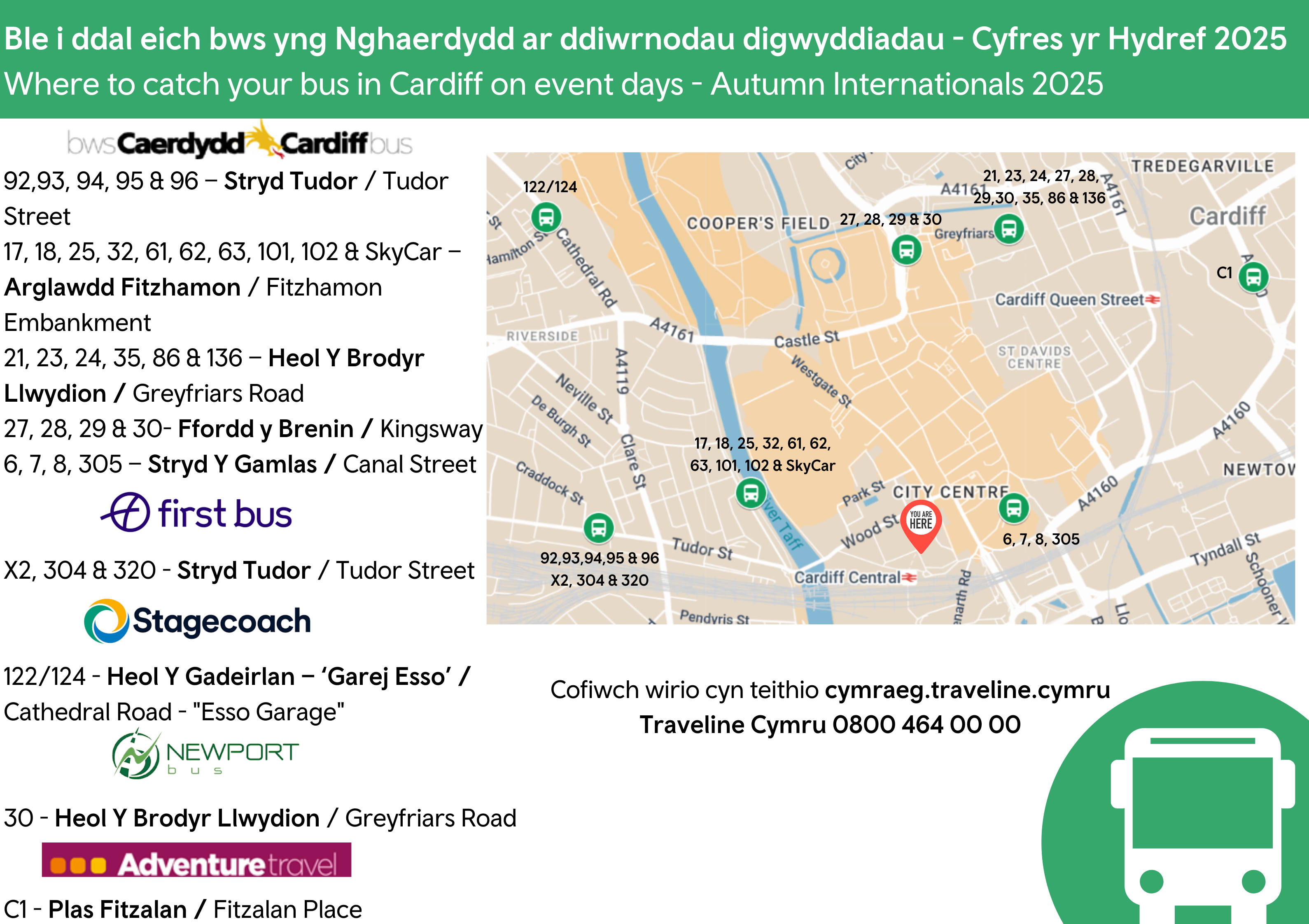 - Bydd Cyfnewidfa Bysiau Caerdydd yn cau yn unol â chau’r ffyrdd rhwng 11:00 - 19:15 ar 9, 22 a 29 Tachwedd a rhwng 13:30 - 22:00 ar 15 Tachwedd