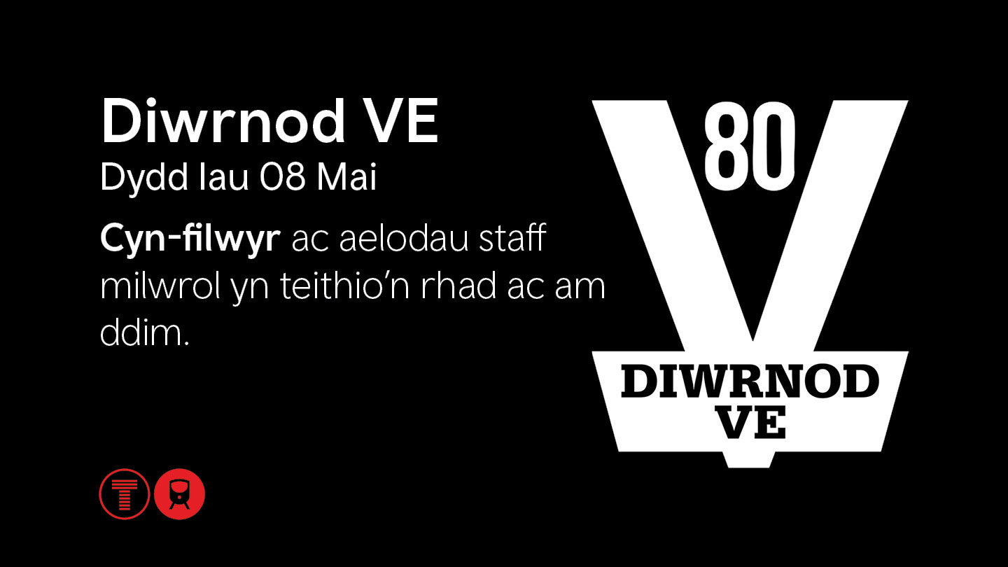 Rydym yn cynnig tocynnau trên am ddim i staff milwrol cyfredol, yn ogystal â chyn-filwyr, er mwyn nodi Diwrnod VE yfory.