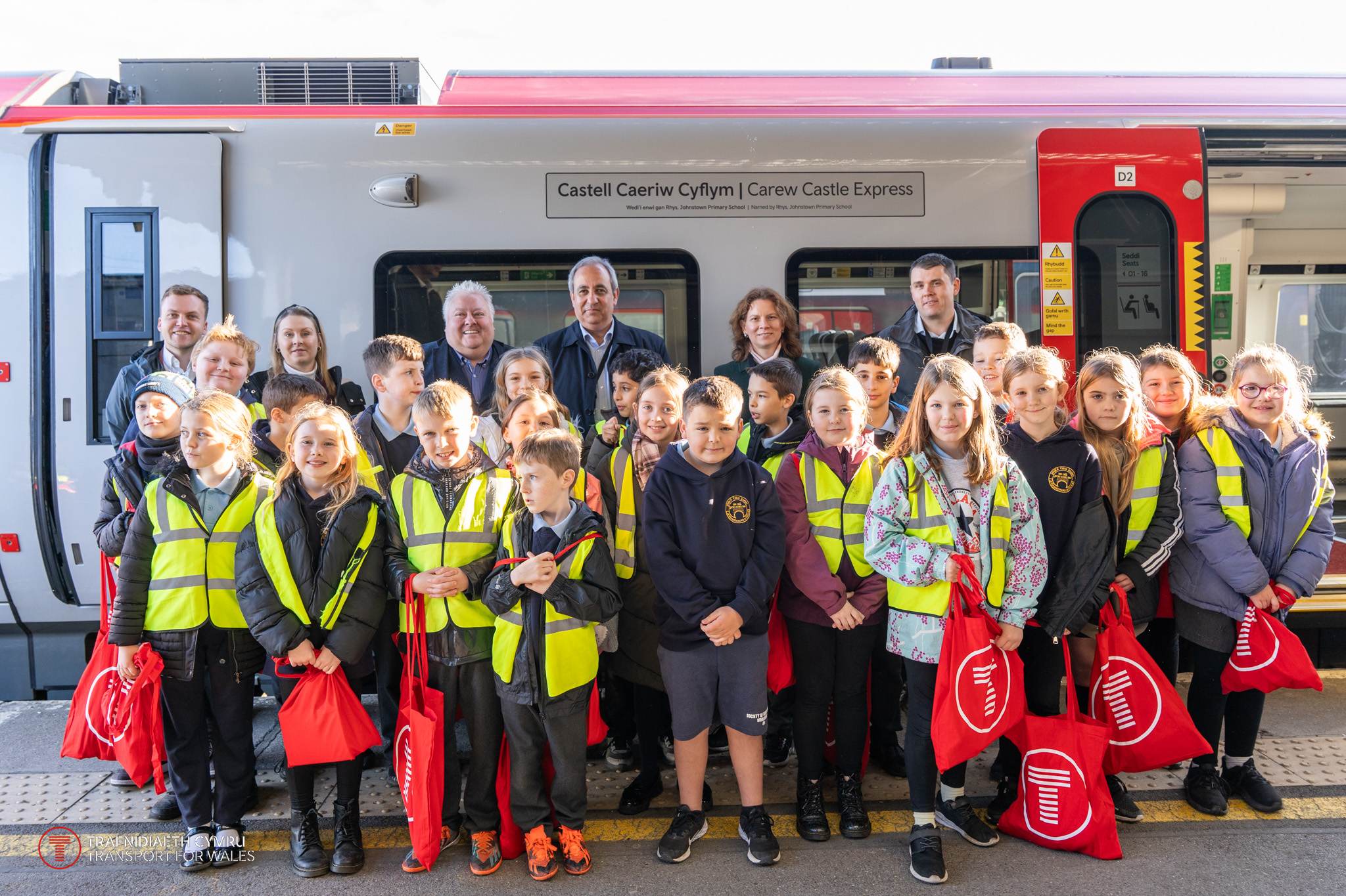 Heddiw, gwahoddwyd Rhys a phlant eraill o'r ysgol i Orsaf Reilffordd Caerfyrddin (dydd Iau 16 Tachwedd) i weld yr enw buddugol yn cael ei ddadorchuddio ar ochr un o drenau Dosbarth 197 newydd sbon TrC.