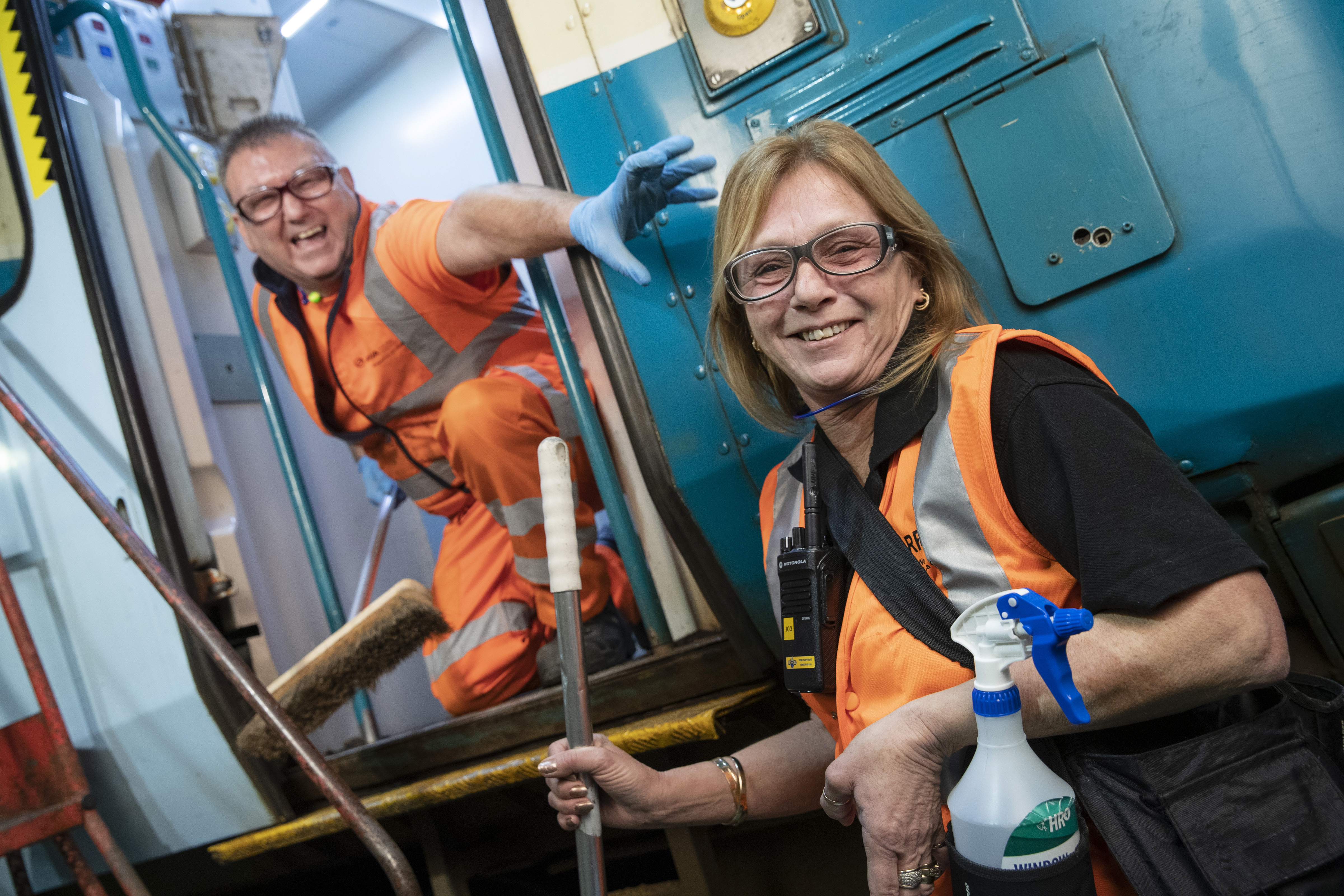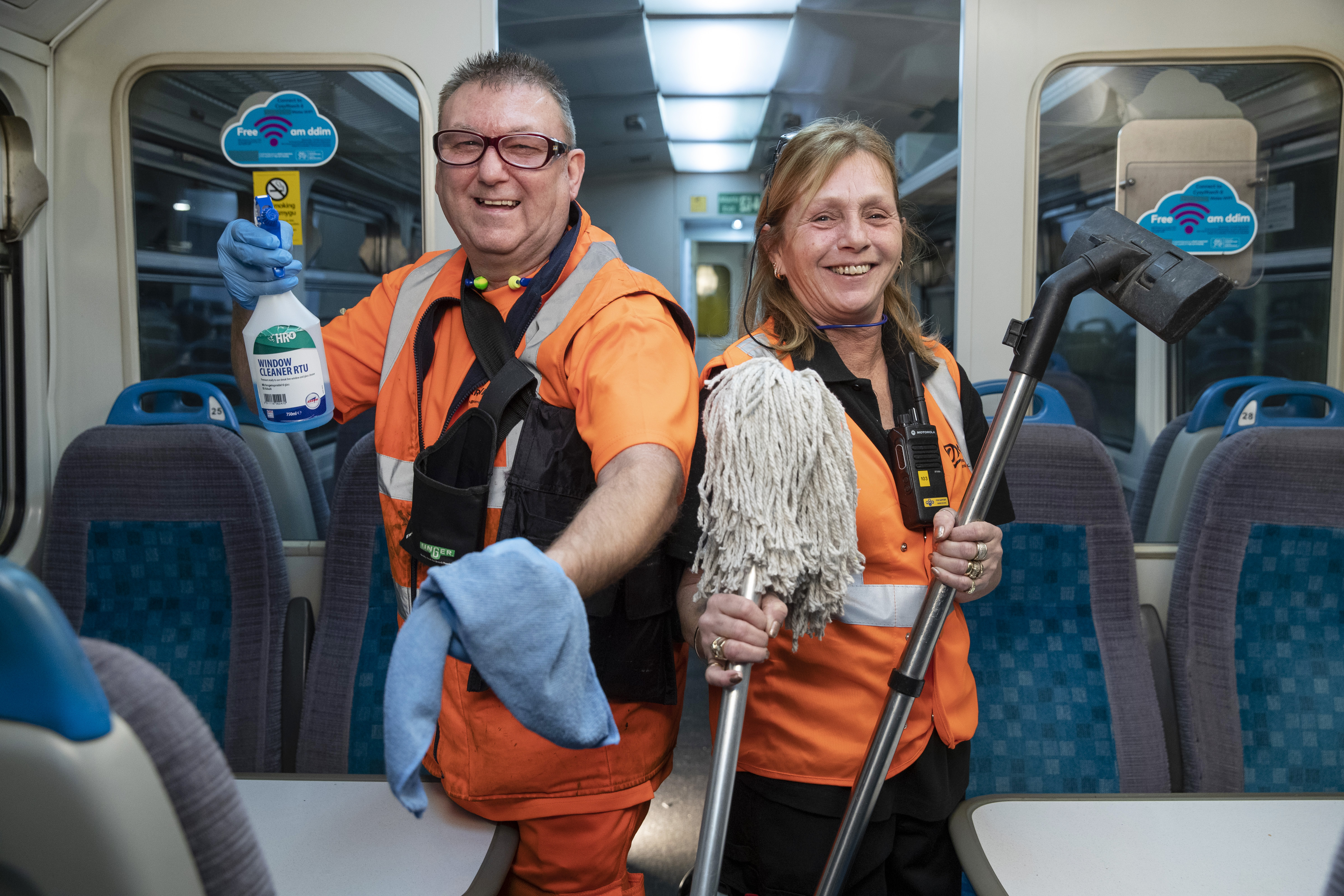 Mae Lynne Bartlett ac Andrew French, ill dau o Gaerdydd, yn aelodau o dîm Ymddangosiad Trenau Trafnidiaeth Cymru ac maen nhw’n treulio oriau bob nos yn paratoi’r cerbydau trên i’r 12,000 o deithwyr sy’n defnyddio’r rhwydwaith bob dydd.