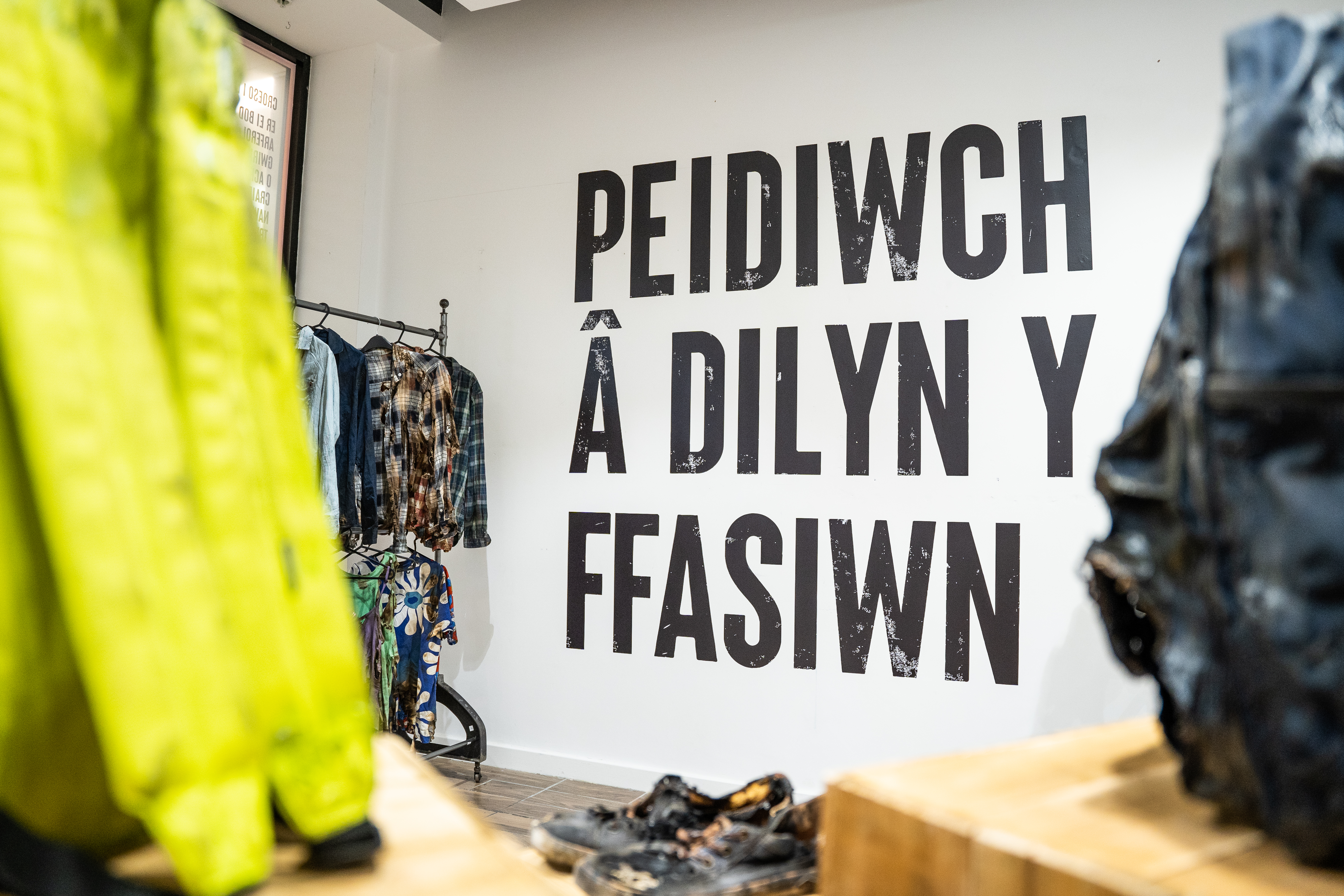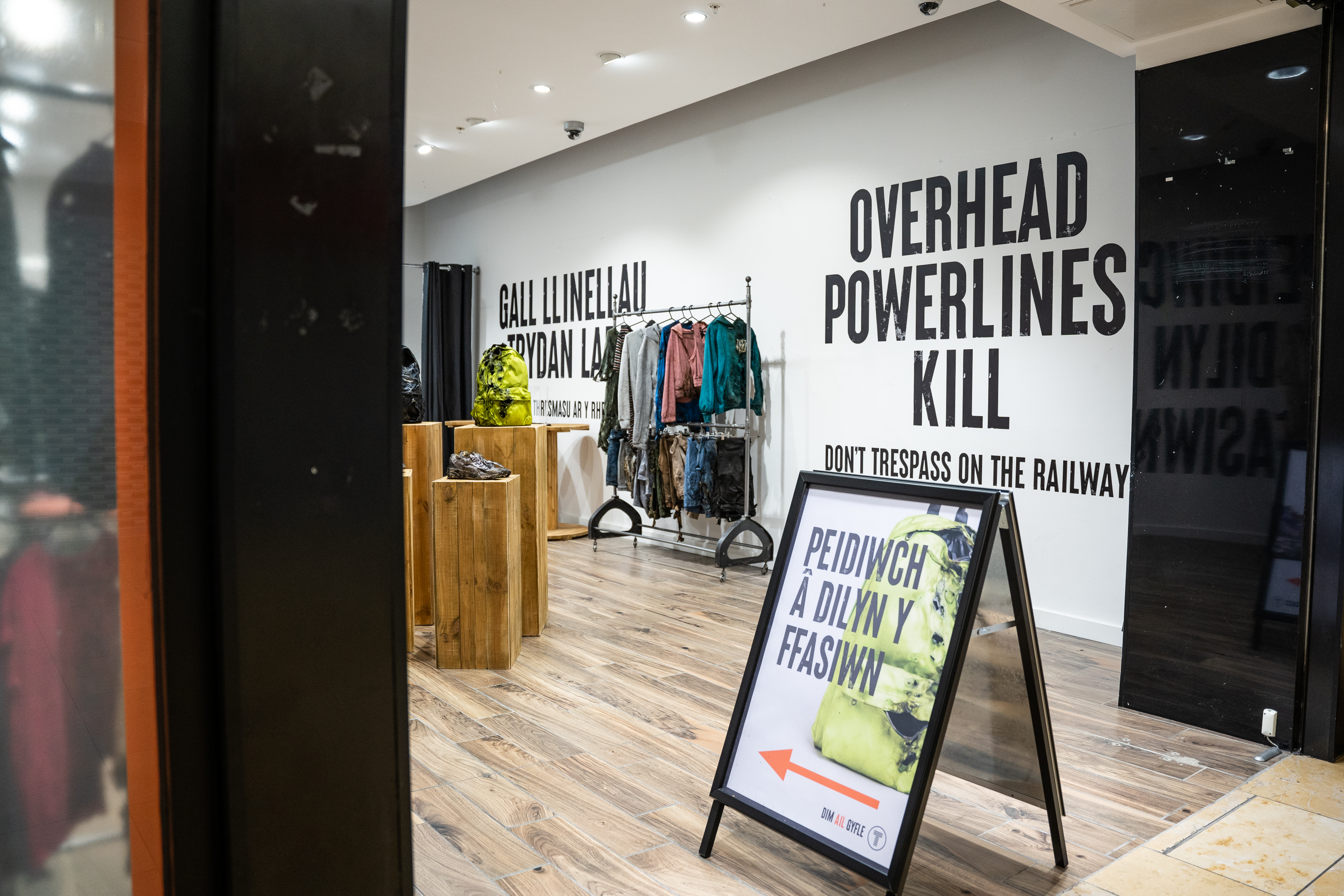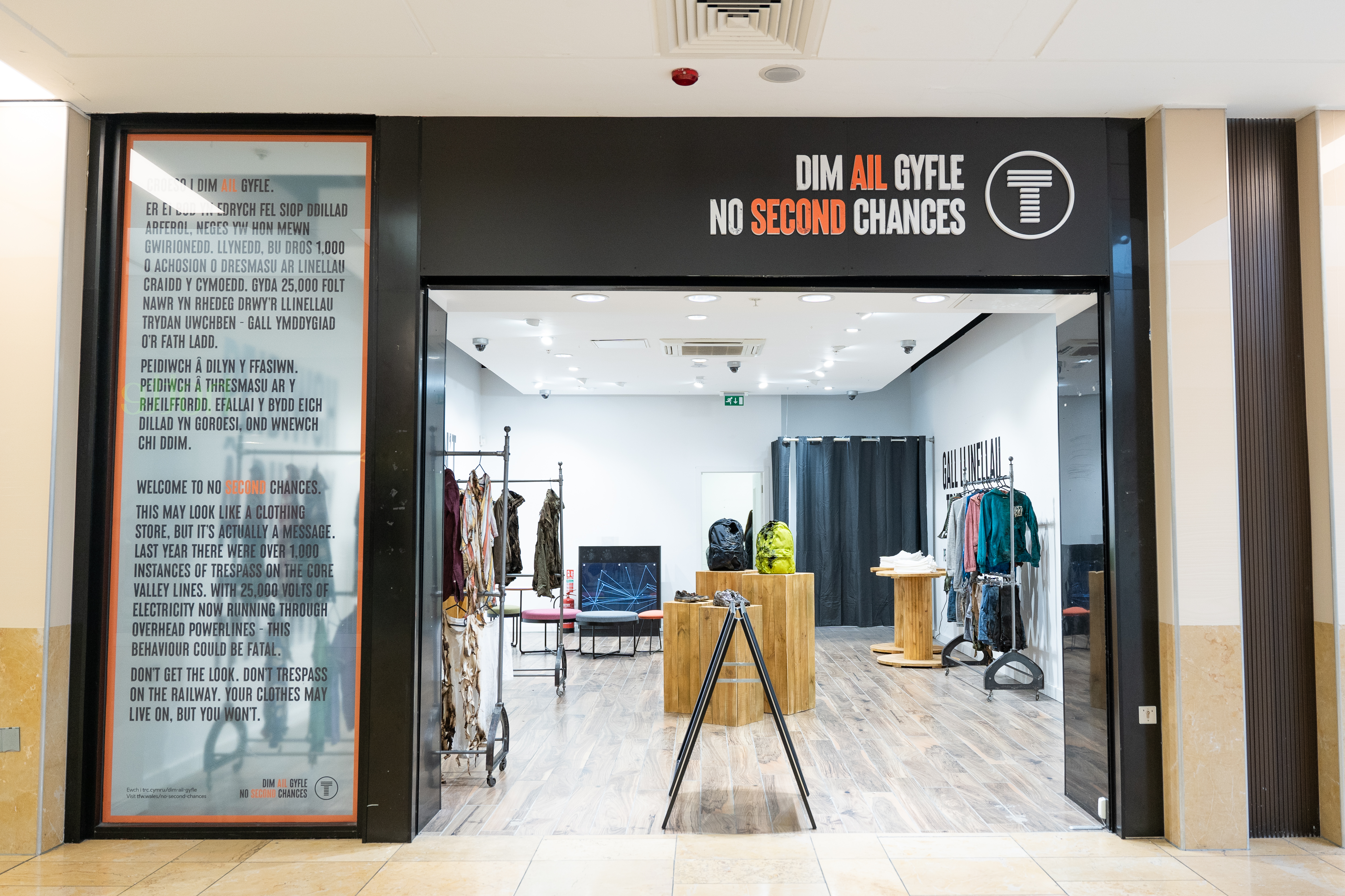 Cafodd yr arddangosfa dros dro ei sefydlu gan Trafnidiaeth Cymru (TrC) fel rhan o’i ymgyrch ‘Dim Ail Gyfle’. Efallai ei fod yn edrych fel nifer o siopau dillad cyfarwydd yng nghanol dinas Caerdydd, ond go iawn mae’n cynrychioli’r difrod gall OLE ei wneud drwy sioc drydanol mewn ffordd weledol, amlwg, gan ddefnyddio dillad dioddefwyr dychmygol. Bydd ymwelwyr yn gweld dillad o bob lliw a llun wedi malu, gan dynnu sylw at y ffaith bod peryglon tresmasu ar y rheilffyrdd yn berthnasol i bawb.