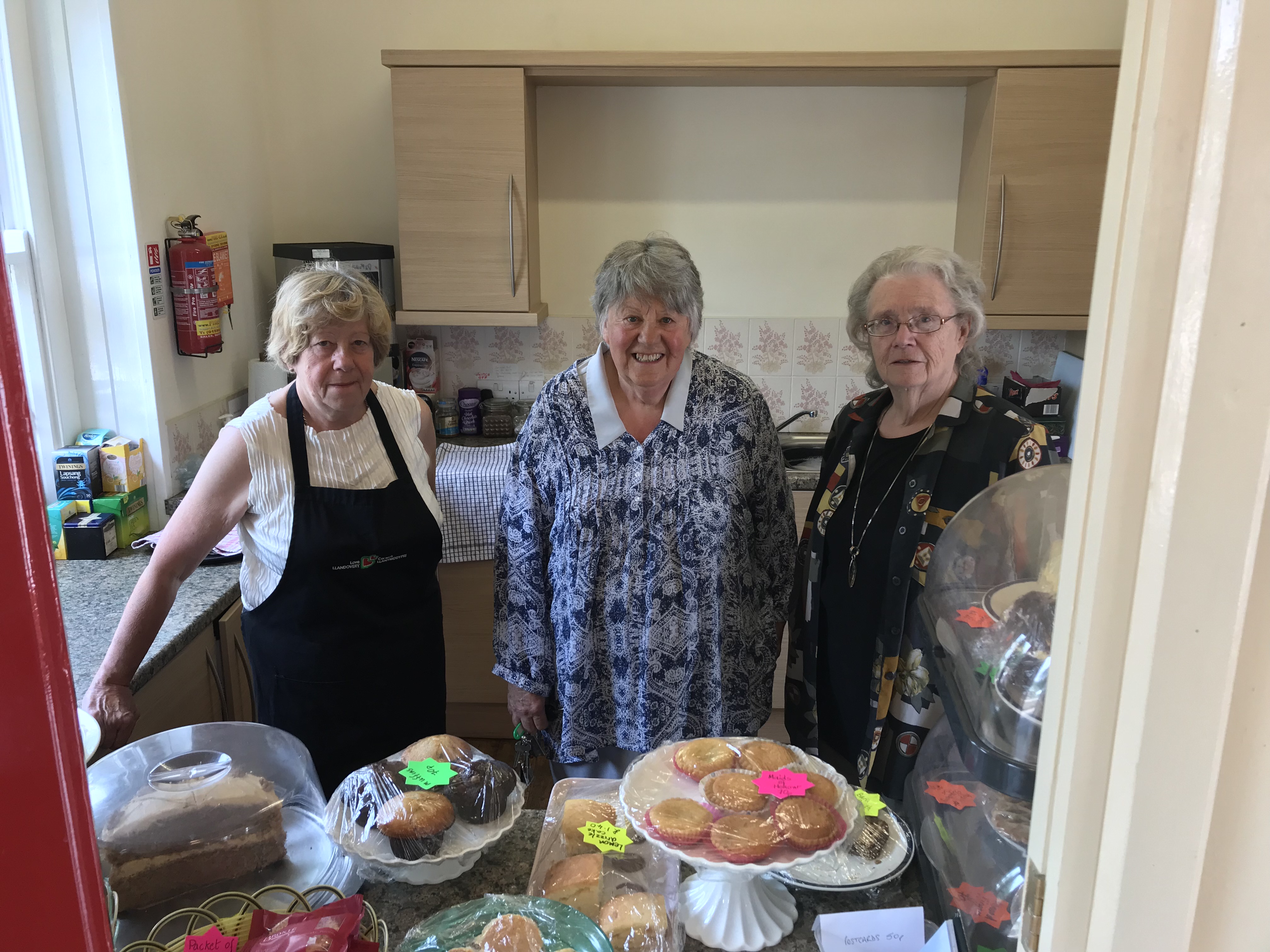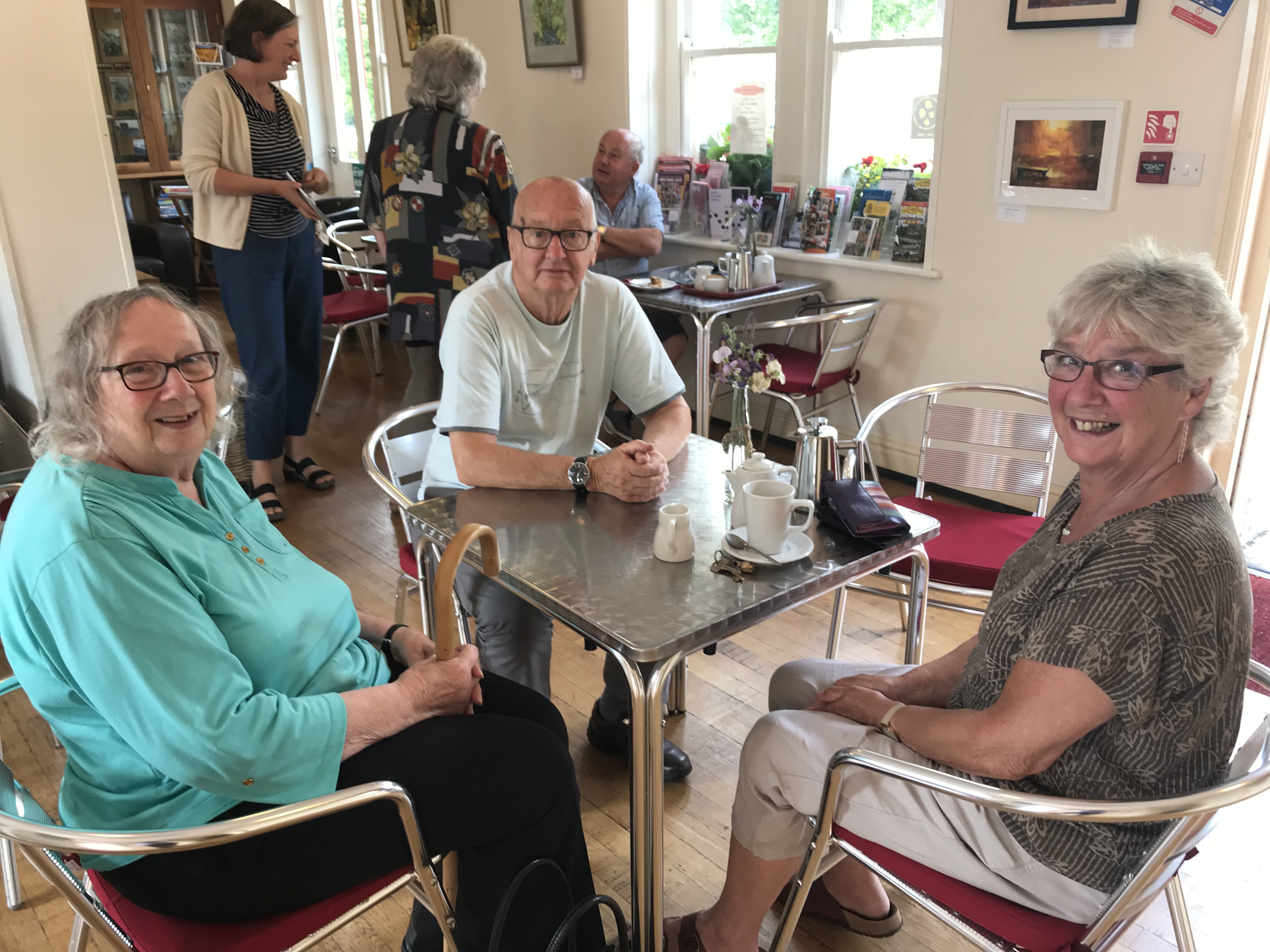 (Mae Valerie a David May a Kathleen Duncan yn aml yn mwynhau mynd am sgwrs i Gaffi Gorsaf Llanymddyfri)