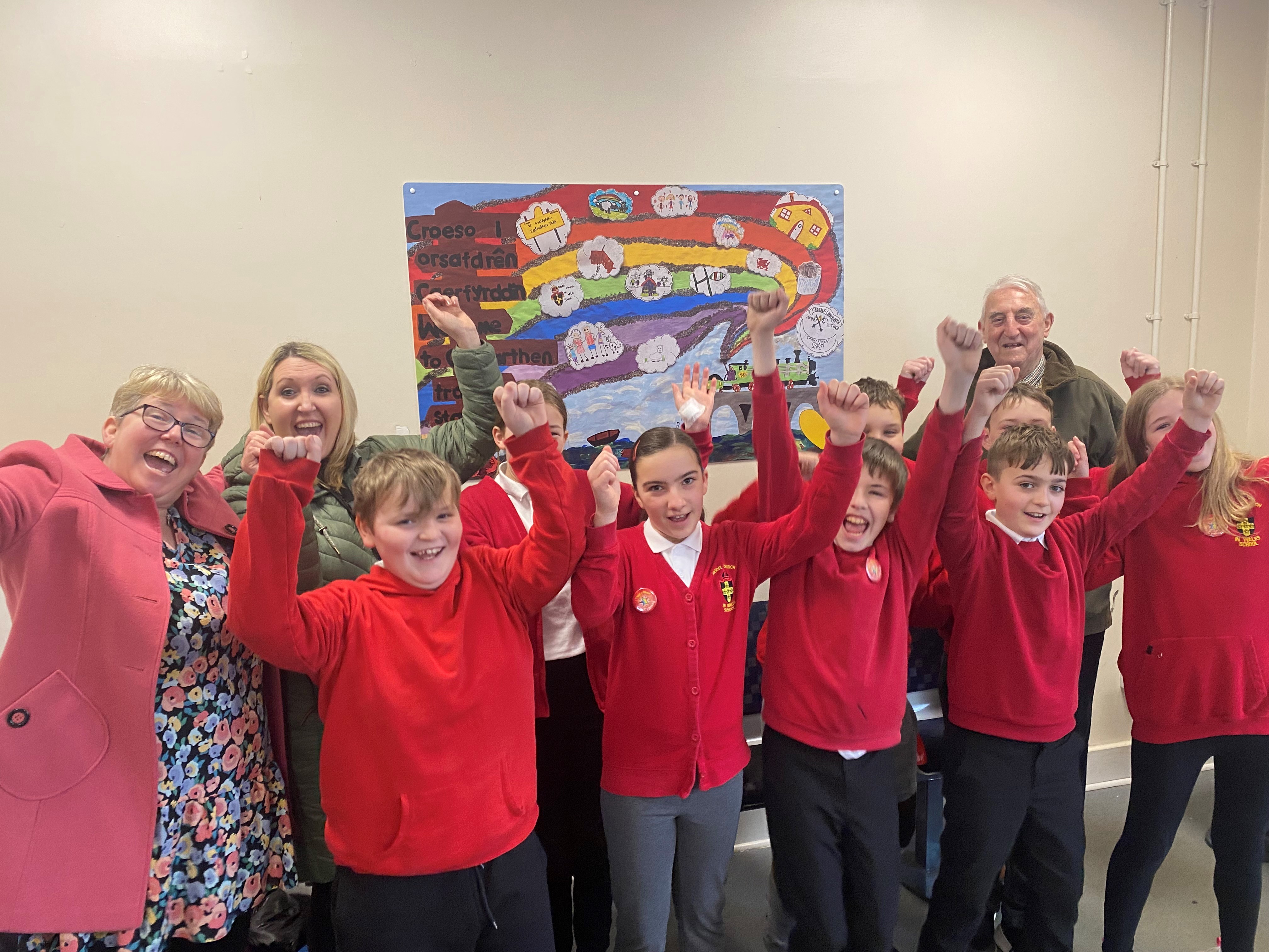 Dywedodd y plant: “Rydyn ni wedi cael llawer iawn o sbort yn helpu gorsaf drenau Caerfyrddin i greu’r faner newydd hwn. Buom yn gweithio gyda'n gilydd i drafod yr hyn yr oedd Caerfyrddin yn ei olygu i ni. Roedden ni’n llawn syniadau.
