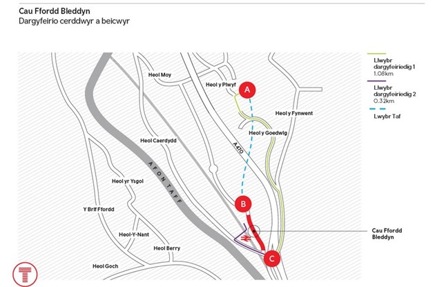 Ddydd Llun 17 Mehefin 2022, bydd ffordd Ffordd Bleddyn ar gau'n llawn i ddefnyddwyr y ffordd, cerddwyr a beicwyr. Bydd cau ffordd Ffordd Bleddyn yn llawn yn golygu na fydd rhan fechan o Lwybr Taf yn cael ei defnyddio, gyda dargyfeiriadau yn eu lle ar gyfer y cau yn para tan Haf 2023, gydag ailagor ffordd Ffordd Bleddyn. Dangosir y llwybrau dargyfeirio arfaethedig yn y map isod, gyda llwybr 1 wedi'i ddargyfeirio ar y map mewn gwyrdd.