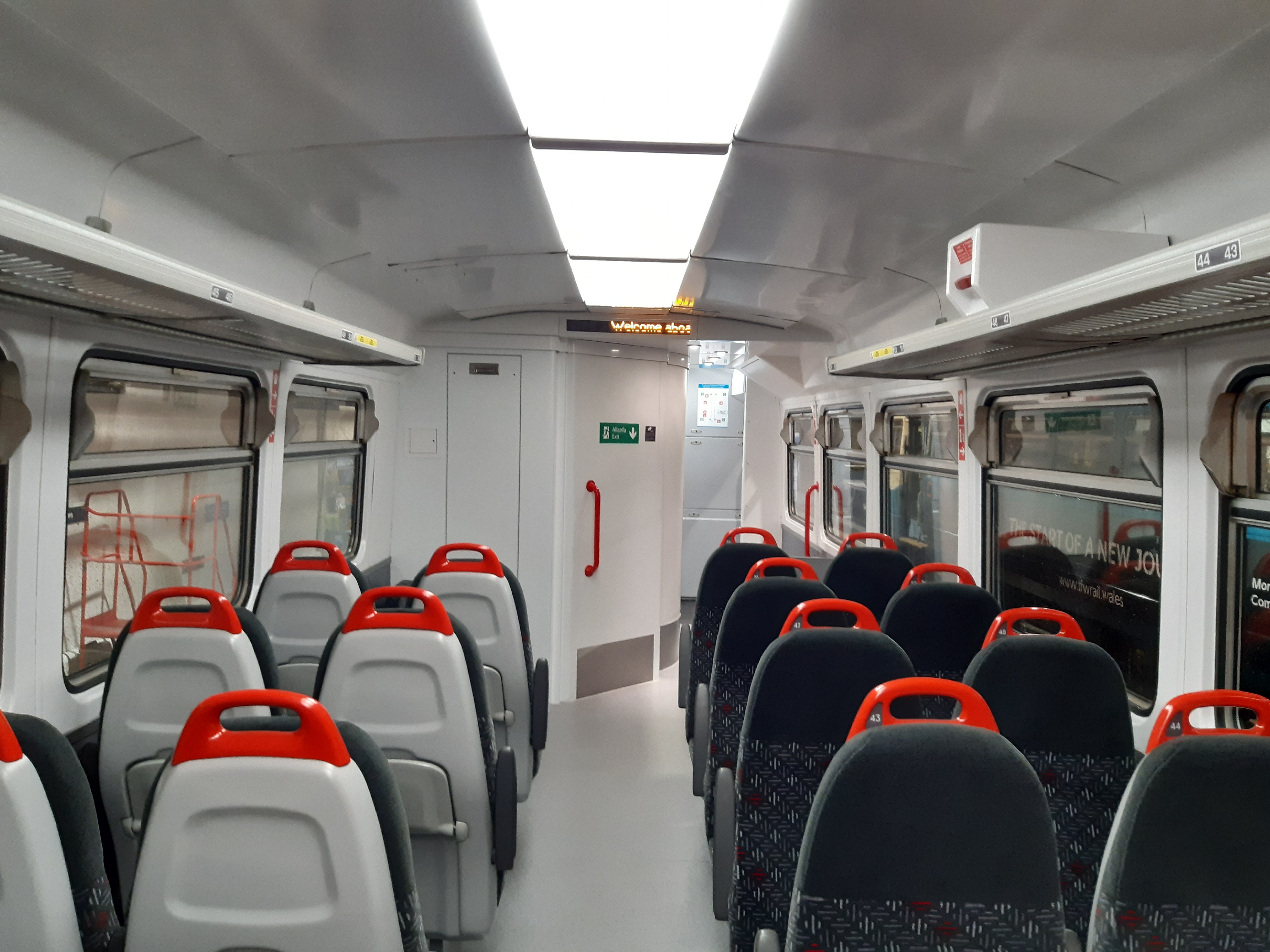 (Tu mewn i drên dosbarth 153 are ei newydd wedd, gyda socedi plygiau ac USB wedi'u gosod)