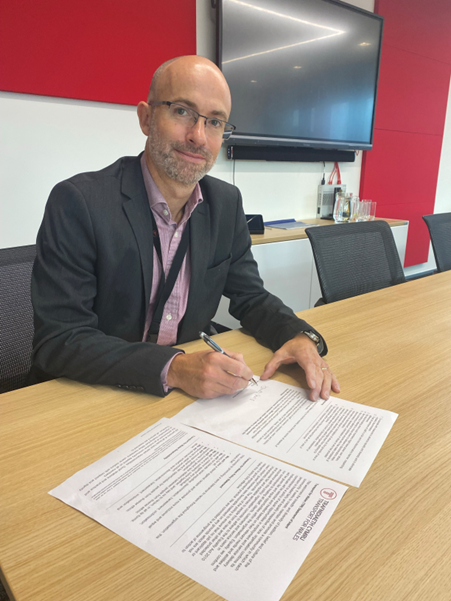 Mae James Price, Prif Swyddog Gweithredol TrC wedi arwyddo addewid Cymru Wrth-hiliol ar ran Trafnidiaeth Cymru.