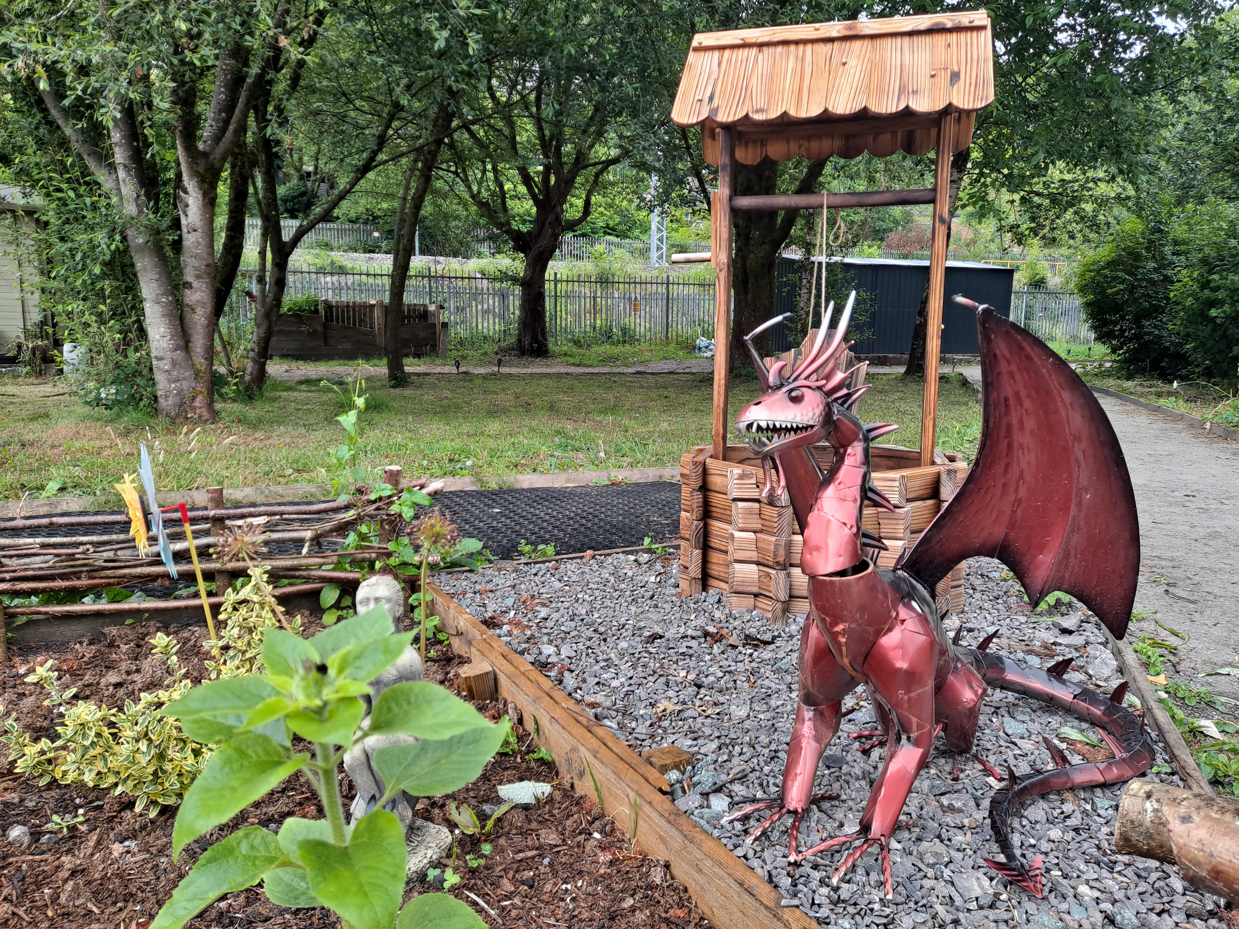 Mae’r ardd sy’n cael ei chreu a’i defnyddio gan bobl ifanc sy’n mynychu’r safle yn cynnwys plannu synhwyraidd, nodweddion hudol organig fel creigiau, caws llyffant a chimes gwynt, giât lleuad a man dysgu awyr agored a elwir yn lleol yn ‘dŷ hobbit’.